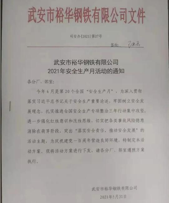 今年6月是第20個(gè)全國(guó)“安全生產(chǎn)月”,為深入貫徹落實(shí)習(xí)近平總書記關(guān)于安全生產(chǎn)重要論述,牢固樹立安全發(fā)展理念,扎實(shí)推進(jìn)安全生產(chǎn)專項(xiàng)整治三年行動(dòng)集中攻堅(jiān),進(jìn)一步強(qiáng)化紅線意識(shí)和底線思維,切實(shí)把各類事故風(fēng)險(xiǎn)隱患消除在萌芽階段,突出“落實(shí)安全責(zé)任,推動(dòng)安全發(fā)展”的活動(dòng)主題,全力維護(hù)安全生產(chǎn)形勢(shì)持續(xù)穩(wěn)定,為慶祝建黨百年?duì)I造良好環(huán)境,6月1日,裕華鋼鐵“2021年安全月啟動(dòng)大會(huì)”在公司能源三樓會(huì)議室召開。